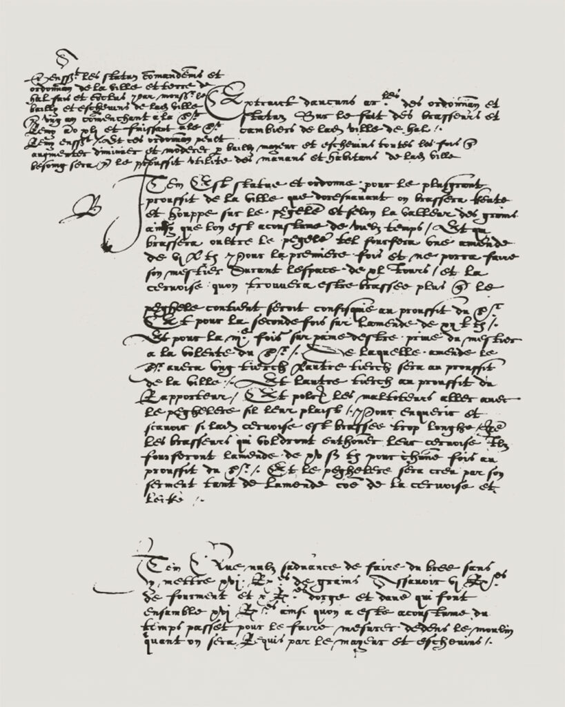 År 1559 fastställde stadskassören Remy Le Mercier i den belgiska staden Halle en ordonnans som reglerade exakt vilka spannmålsproportioner som fick användas i de lokala ölsorterna keut och houppe. Bryggare som avvek från dessa regler riskerade böter.